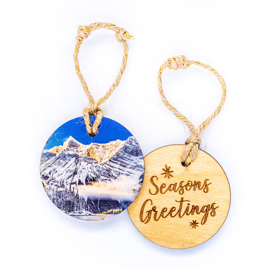Adorno navideño circular de madera<br> Felices Fiestas<br> Montañas Rocosas del país de KananaskisPrecio habitual $17.00 CADPrecio habitualPrecio unitario por-