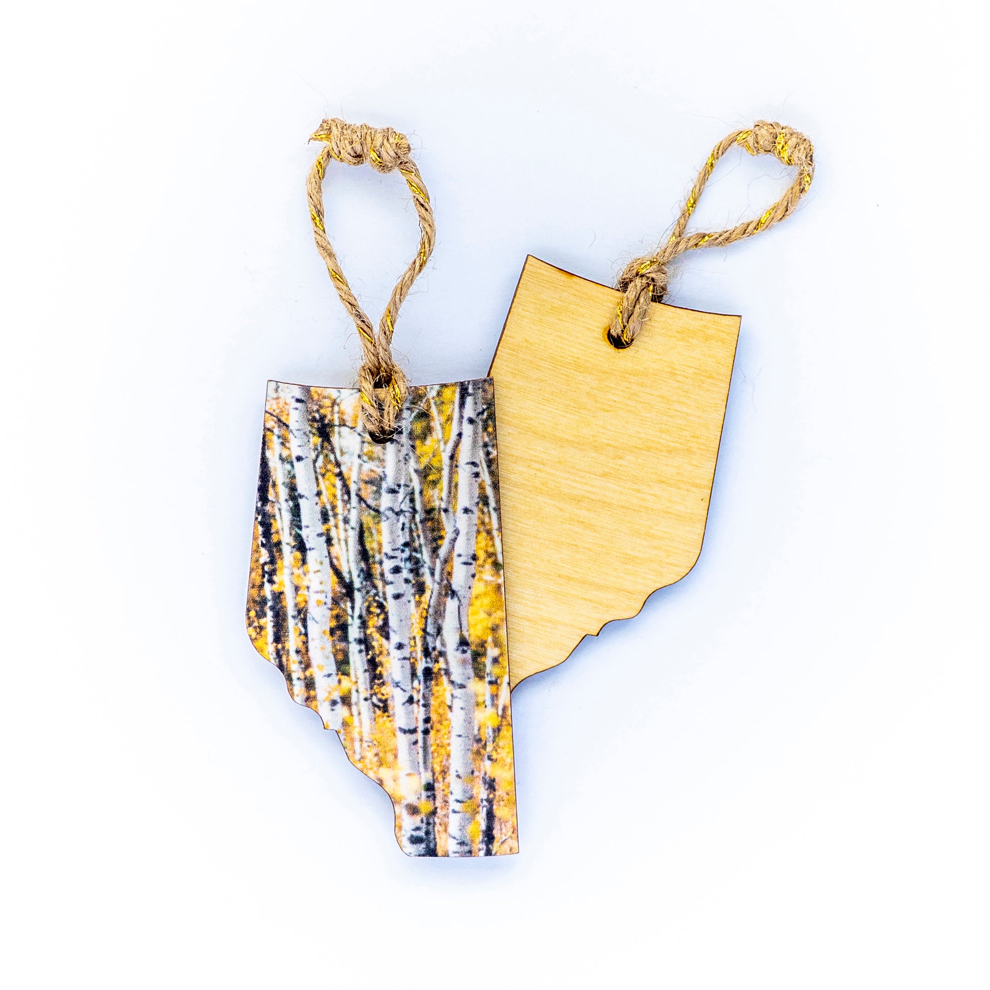 Adorno navideño de madera de Alberta con espalda en blanco y álamos en otoño